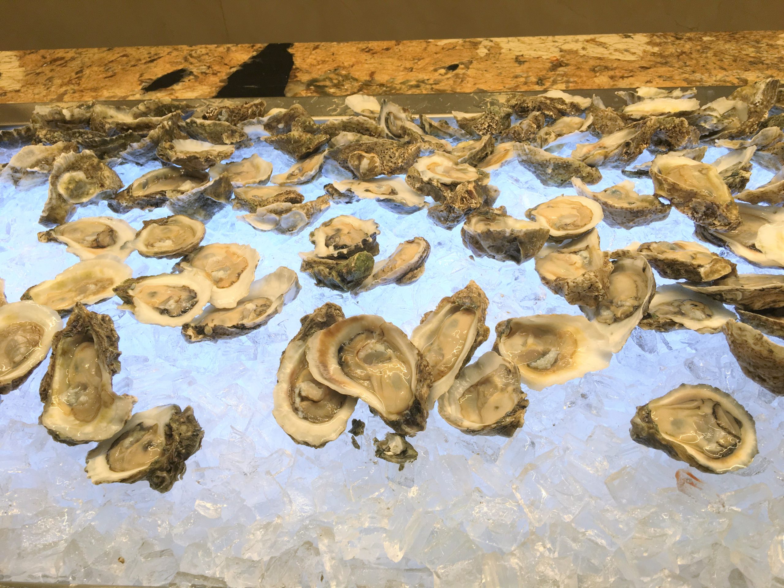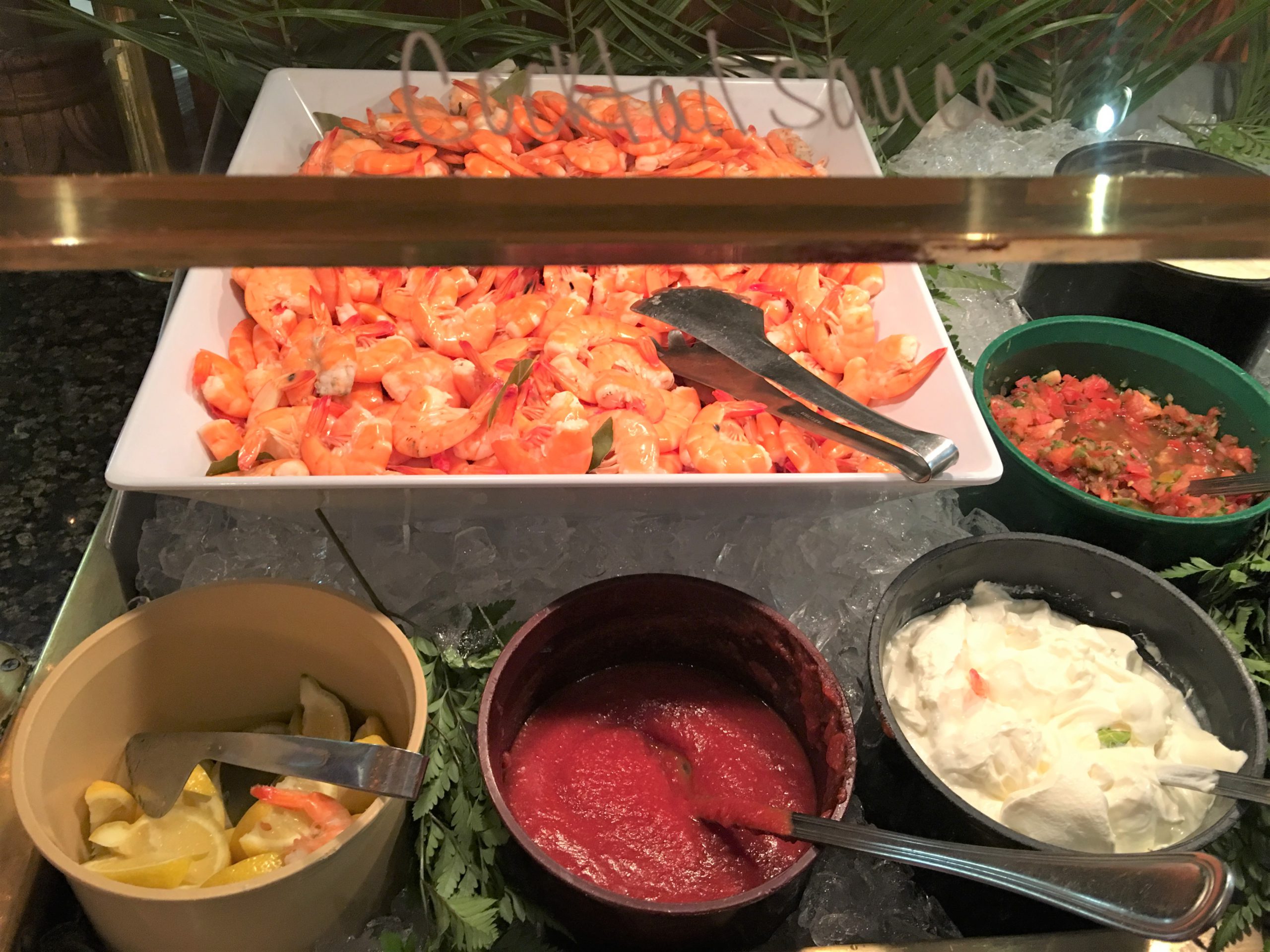 ここのシャンペンブランチは蒸し海老をはじめ、蟹、牡蠣、ムール貝、スモークサーモン、などなど海鮮類と、蒸し海老餃子、蒸し小籠包などの点心が豊富。店内はトロピカルな感じでテーマパーク内のレストランみたいに心がはしゃぎます。