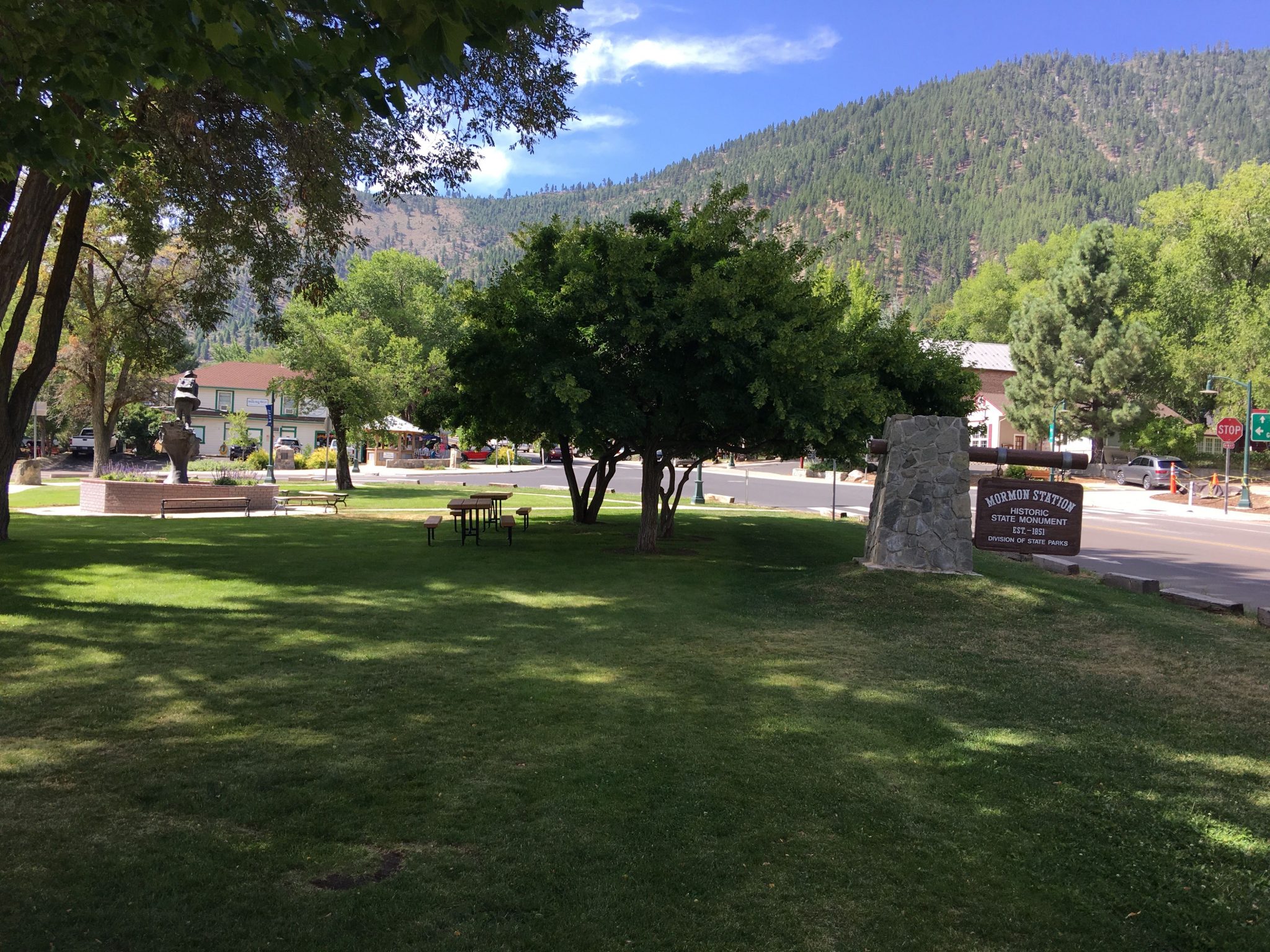 Genoa Country Innの真ん前にある緑豊かな州立史跡公園。ネバダ州とカリフォルニア州をつなぐ街道に金鉱等の交易所として1851年に建てられたのがモルモン・ステーション。園内は緑豊かで木陰のある散歩道があり、当時使われた馬車や農耕具などが展示されているスポットもあります。銅像は ジュノアの英雄、ジョン・”スノーシュー”・トンプソン。1856年~1876年の20年間、カリフォルニア州のプレイサーヴィルとジュノア間の郵便配達を無償で行い、冬の豪雪期間もスキー(あだ名はスノーシューだが、実際にはスキーを使用)を履いて配達をこなした凄い人です。