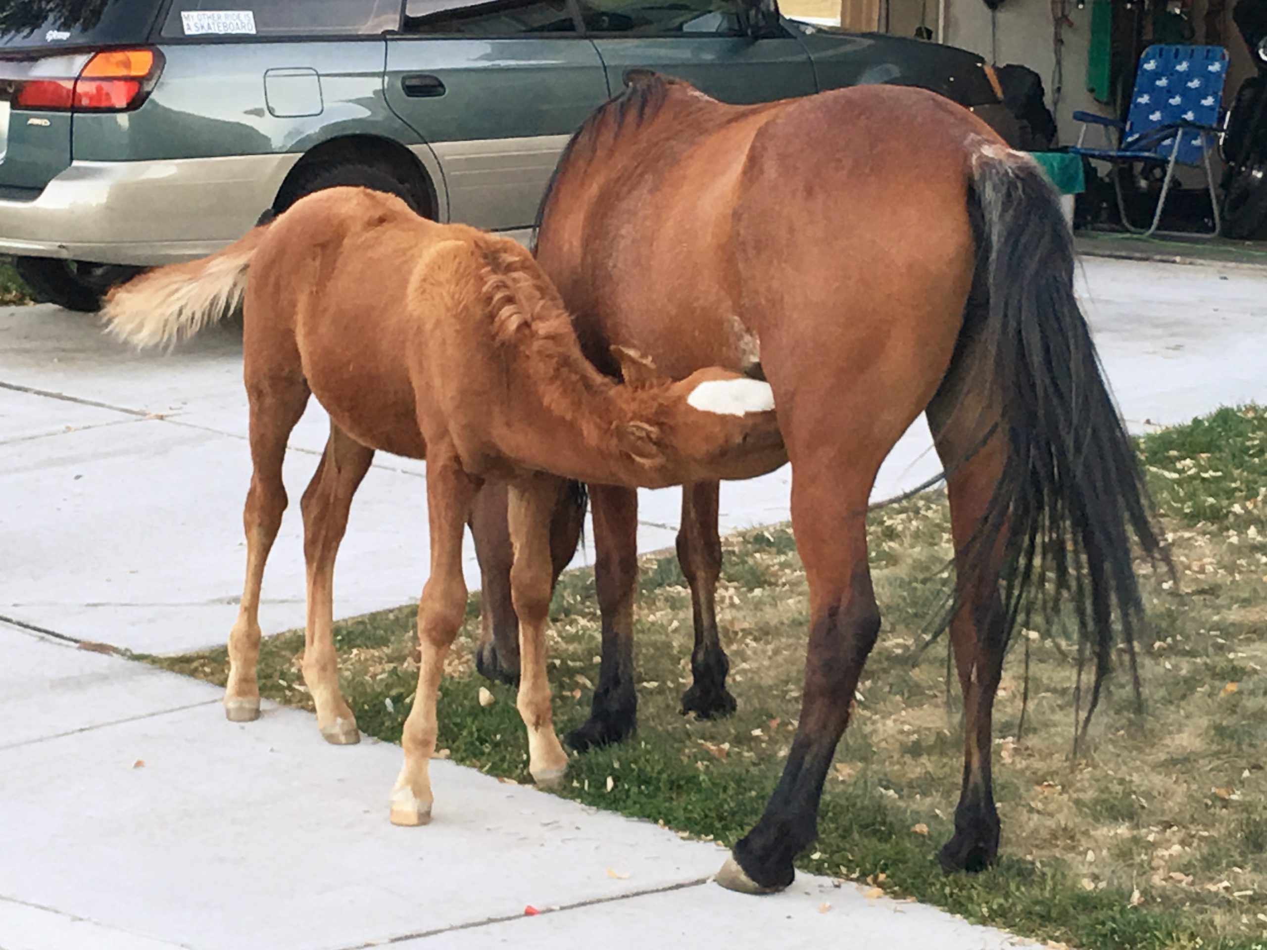愛らしい親子馬。警戒心ゼロなんでしょうか、誰かのお家の前で授乳中。子馬がいると尚更近づくのは禁物なのでこれら写真はもちろん望遠で撮影しています。