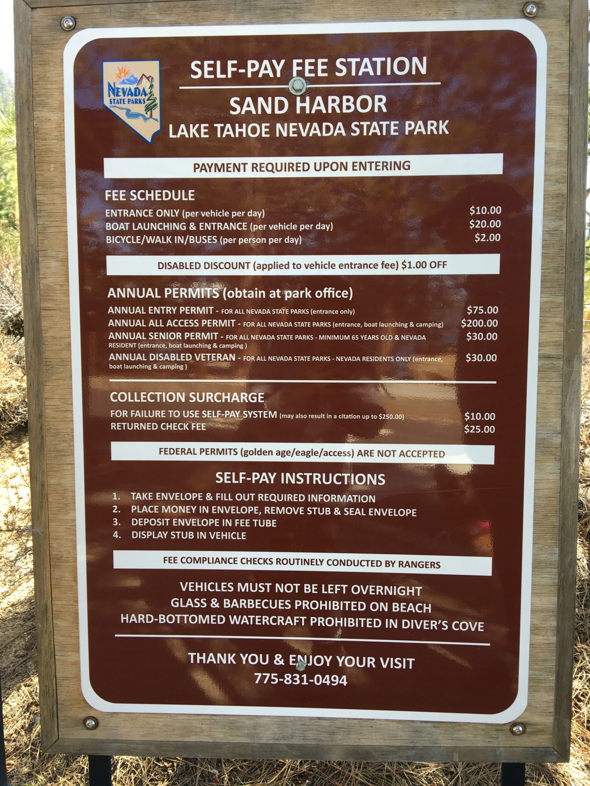 さて、タホ湖で遊ぶのに最も気になる駐車場ですが、トレイルの北側スタート地点に91台分完備されてます。SR28(州道28号線)をIncline Villageから南東方面へ下り街が終わるちょい手前左のPonderosa Ranch Roadと交差するSR28の東側側道に駐車場があります。タホ湖周辺の駐車場は激戦区で特に週末は朝早く来ないと!とよく言われますが、日曜とはいえ冬だからか午前10時半に着いて半分程しか埋まっておらず楽勝でした。尚、Sand Harborからスタートする場合は州立公園入園料$10支払いの上州立公園の駐車場を利用できます。公園は開園時間が限られてますのでこちらで確認を。