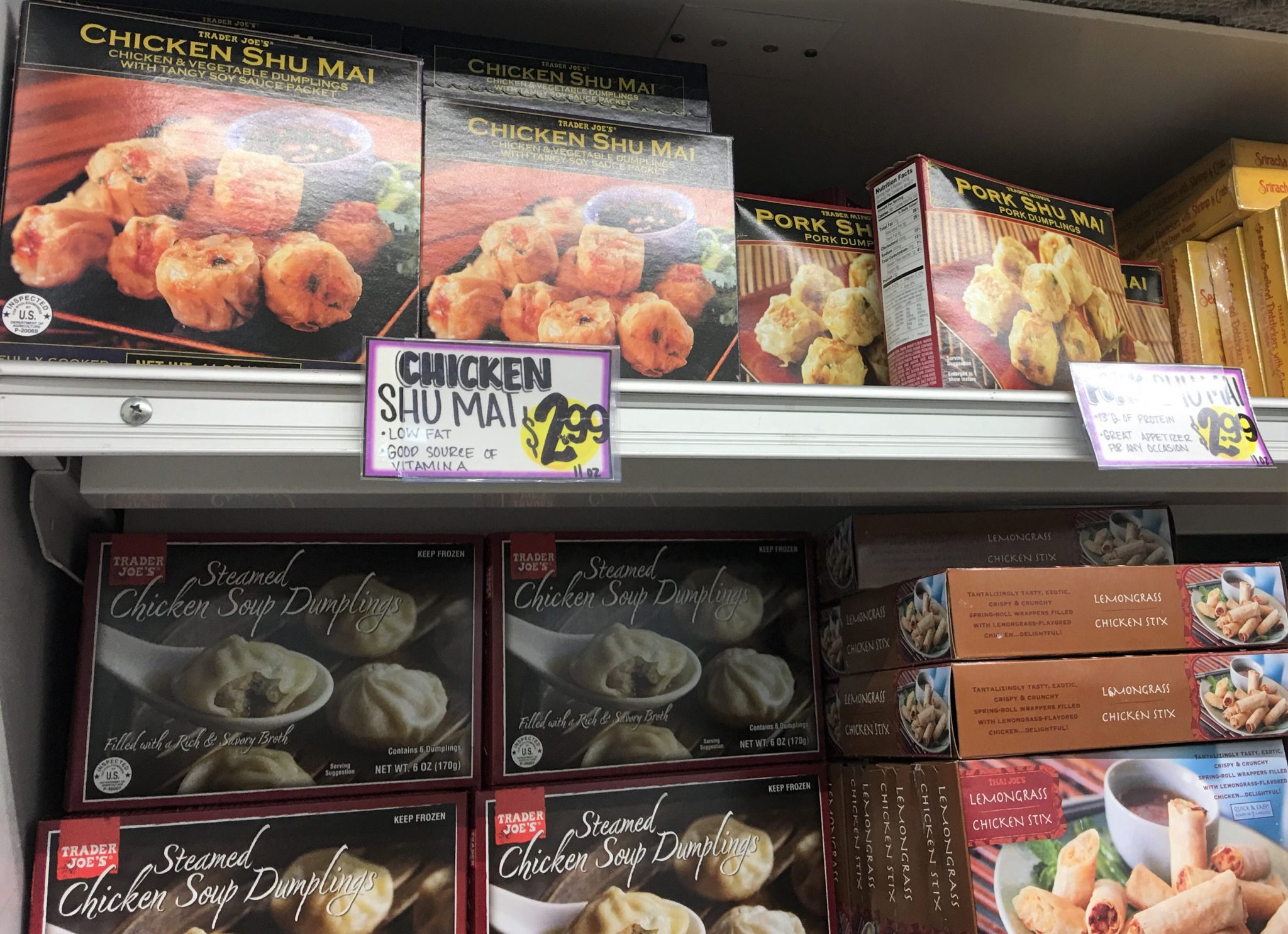 晩御飯の献立に悩む日に助かる冷凍しゅうまい(上左)、冷凍餃子(上右)。日本から遊びに来た母は日本にこそ美味しい餃子い~っぱいあるのに何故かトレジョの餃子の大ファン。餃子は一袋約24個入。上右写真の餃子は豚ですが鶏の餃子やタイ風味な餃子なんかもあります。